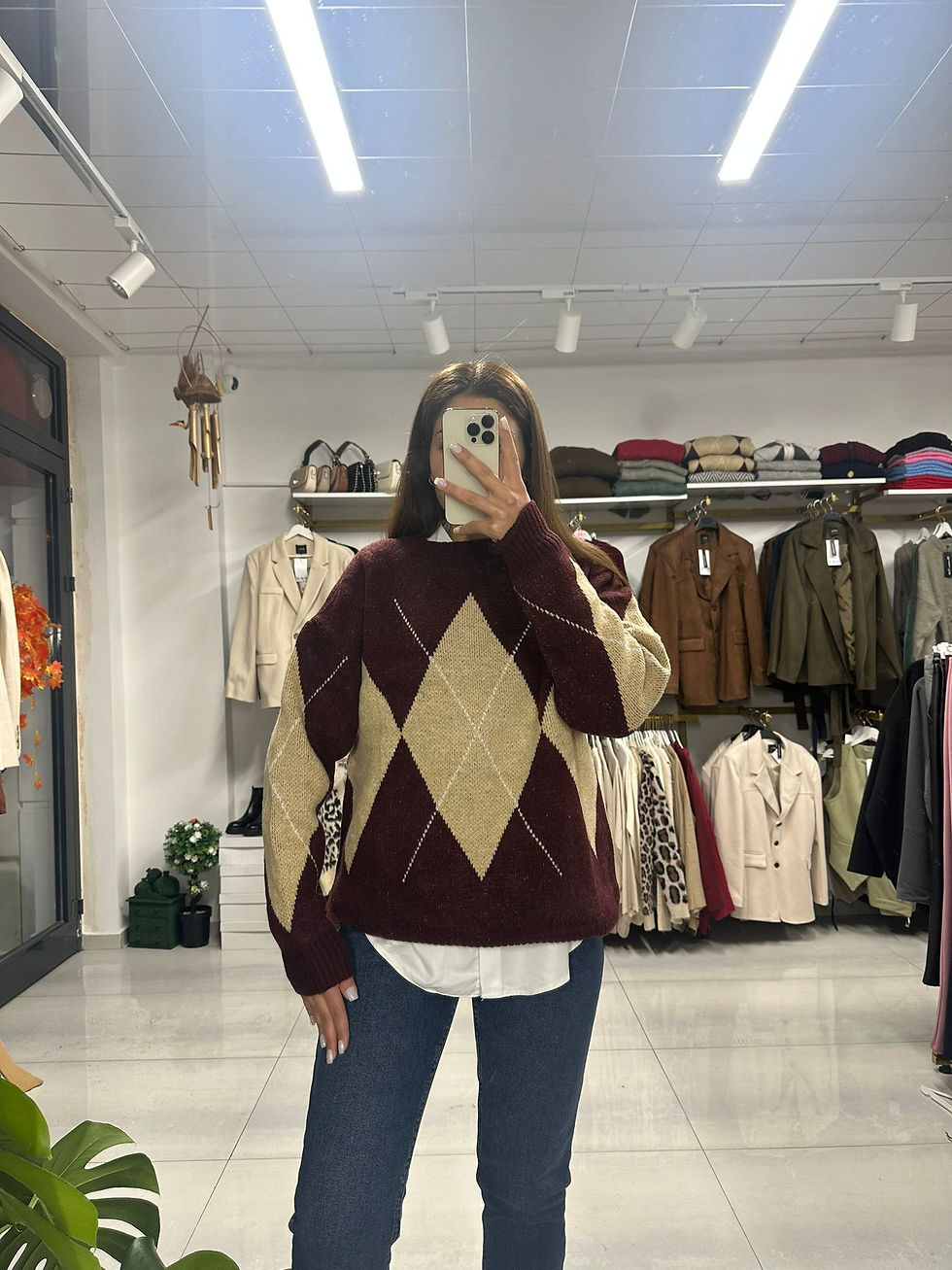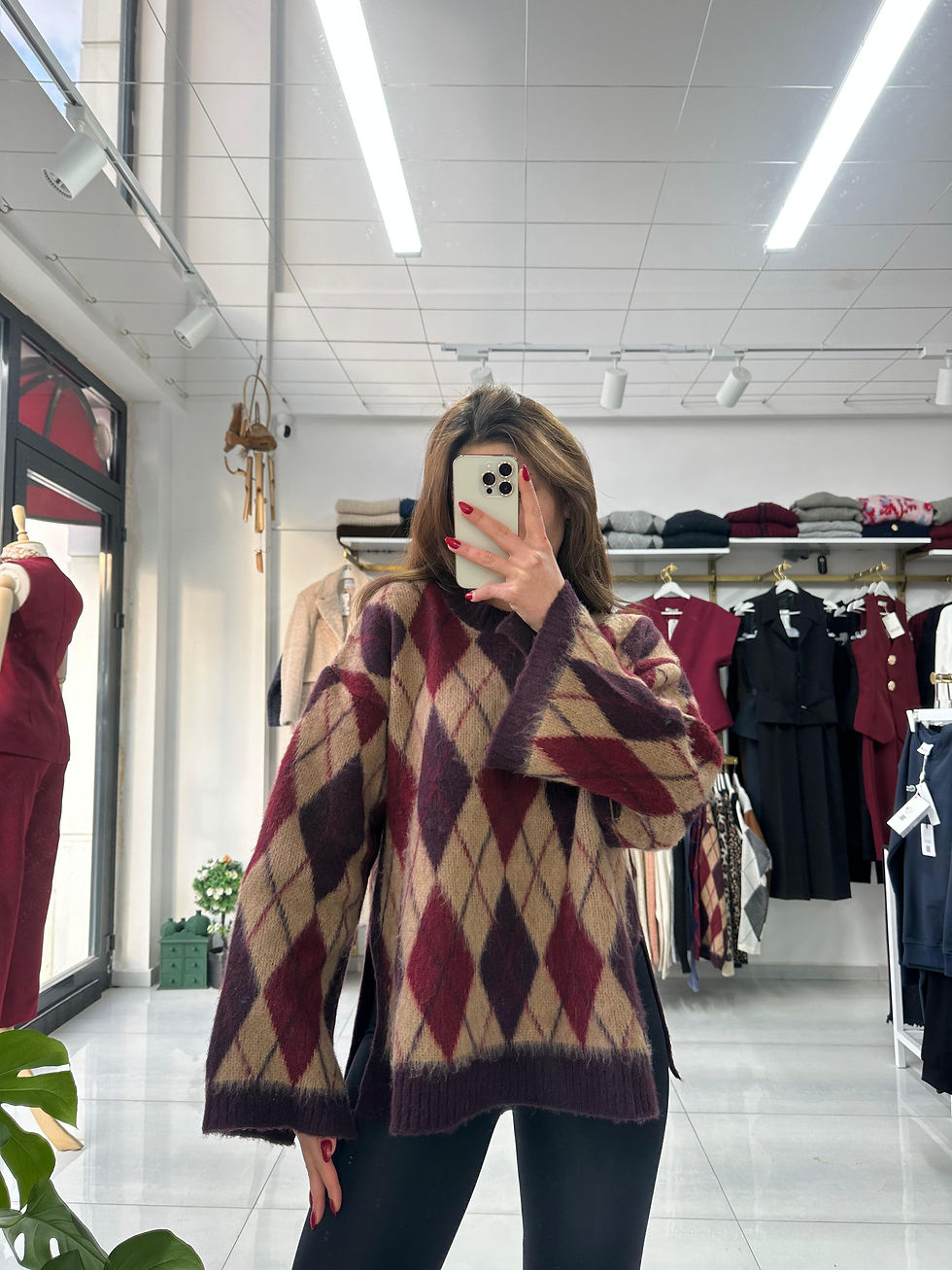 MARKA TASARIMI BAKLAVA DESENLİ KAZAK LACİVERT/BORDO